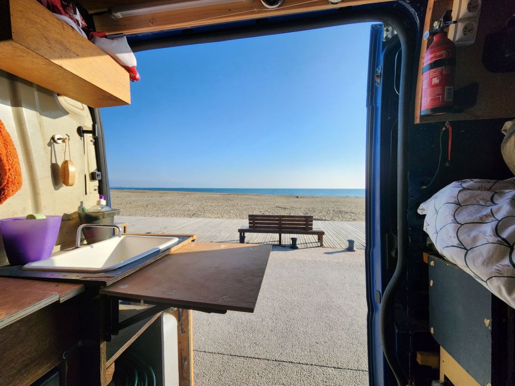 Arrivée après le travail vendredi soir, on se réveille avec un grand soleil samedi matin. Juste magnifique, tu ouvres la porte du fourgon, et vue magnifique, cerise sur le gâteau, personne a l horizon